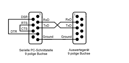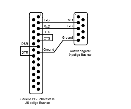 Zur Anbindung des Auswertegerätes "RIKA Easy Score" an den PC wird ein sogenanntes Null-Modem Kabel benötigt. Bei diesem Kabel sind die Verbindungen gekreuzt, im Gegensatz zu einem V24-Verbindungskabel.